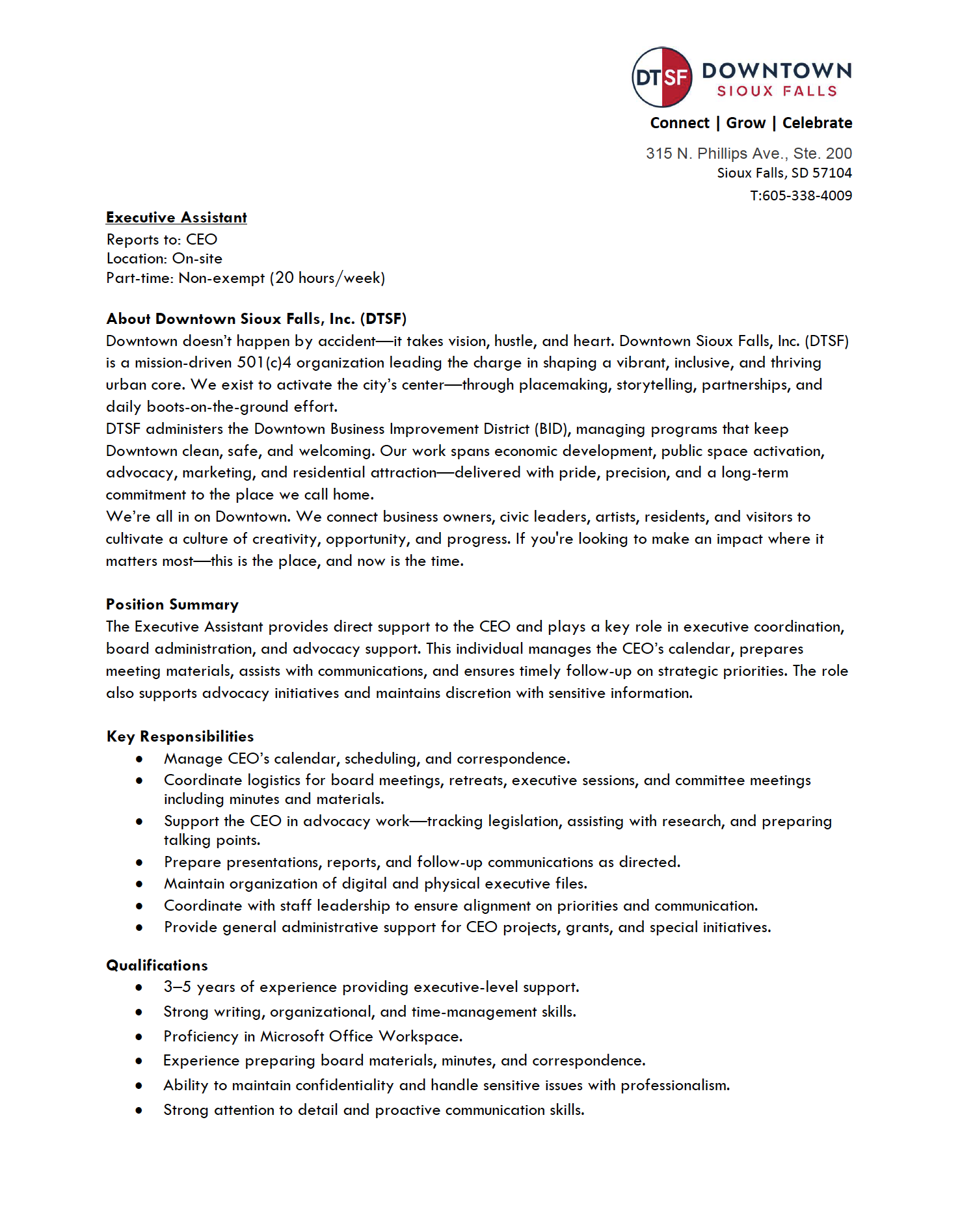 To apply, please send your resume, cover letter, and three professional references to info@dtsf.com with the subject line “Executive Assistant Application.”