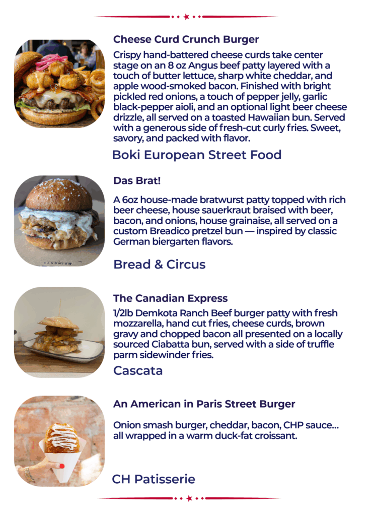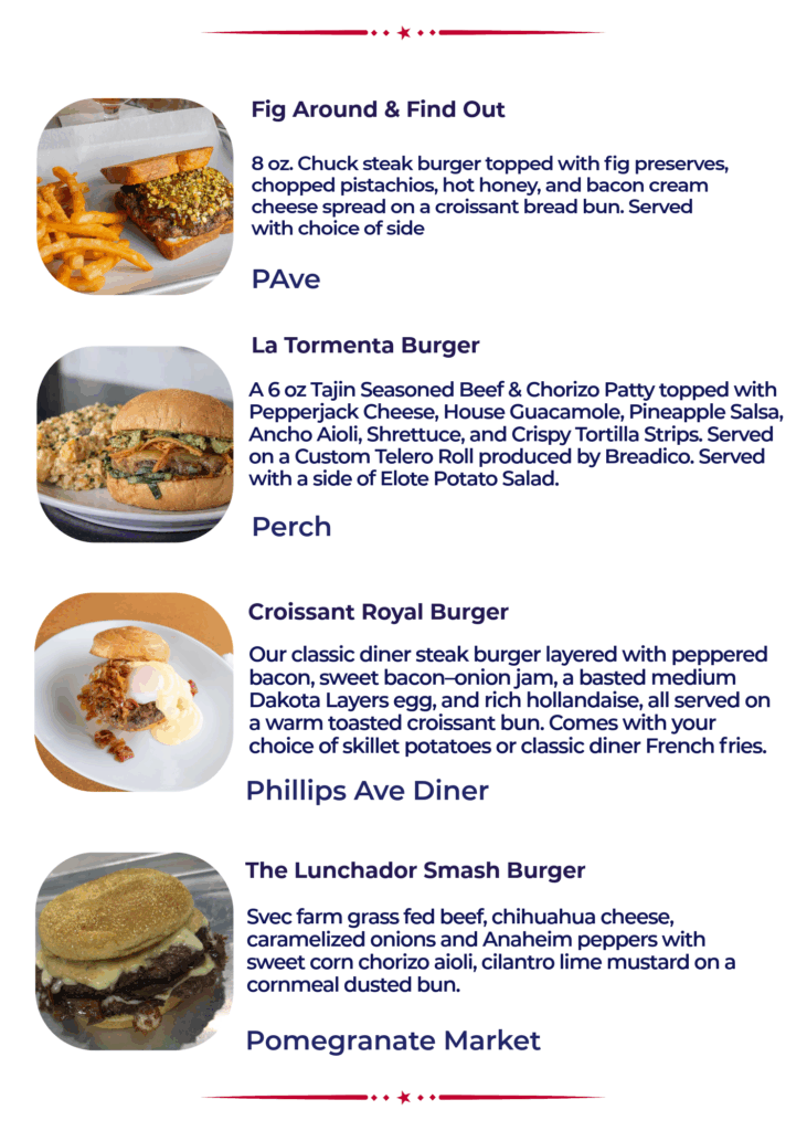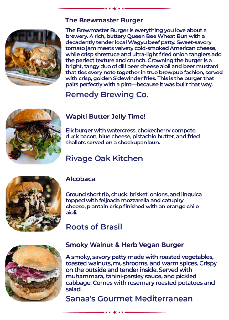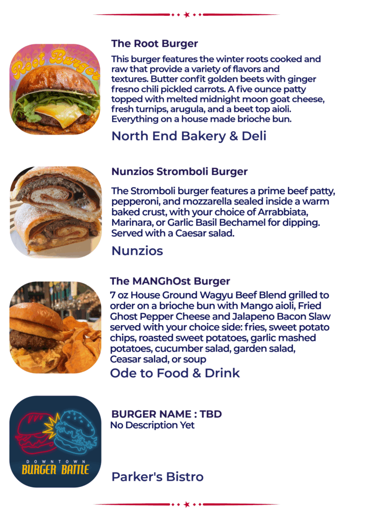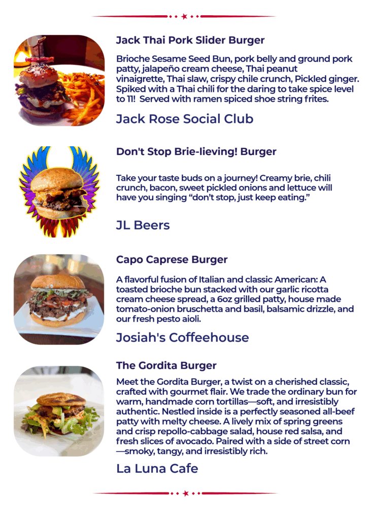 The 13th Annual Burger Battle is a fierce competition featuring 50 different burgers and over 10 first time participants. Read through the menu below (alphabetical by location) and pick your personal burger line up for January 2026. Rank and vote for your favorites on your phone at www.passport.dtsf.com.