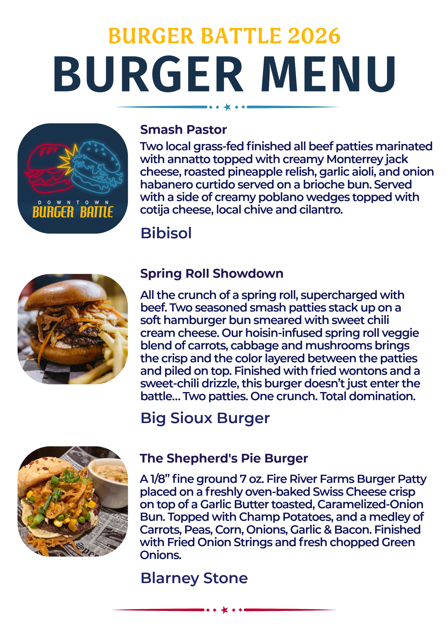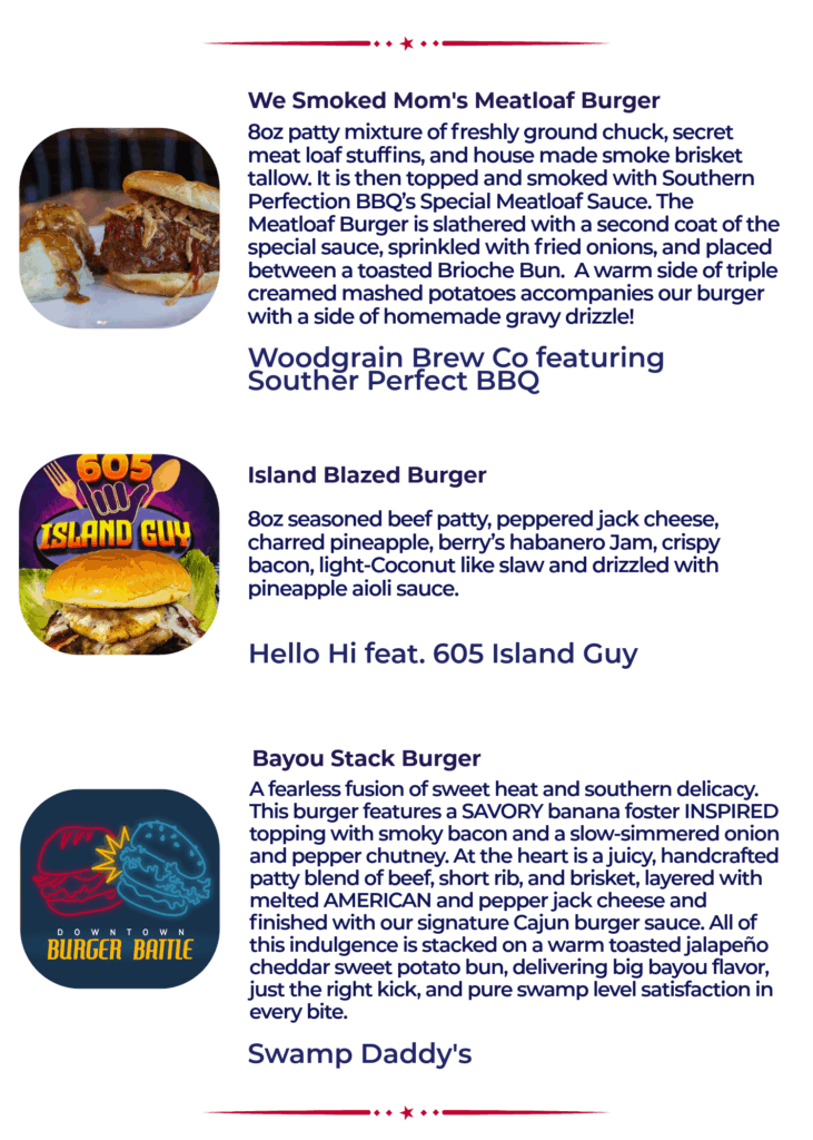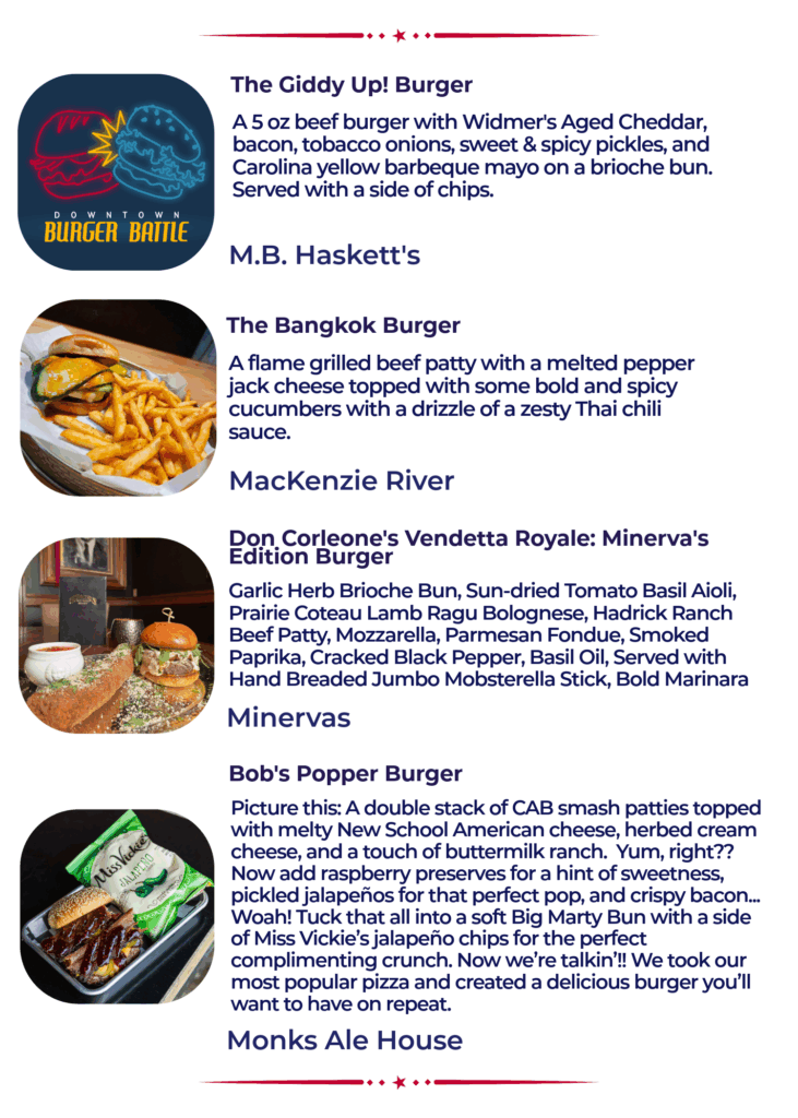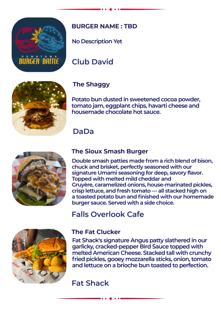 The 13th Annual Burger Battle is a fierce competition featuring 50 different burgers and over 10 first time participants. Read through the menu below (alphabetical by location) and pick your personal burger line up for January 2026. Rank and vote for your favorites on your phone at www.passport.dtsf.com.