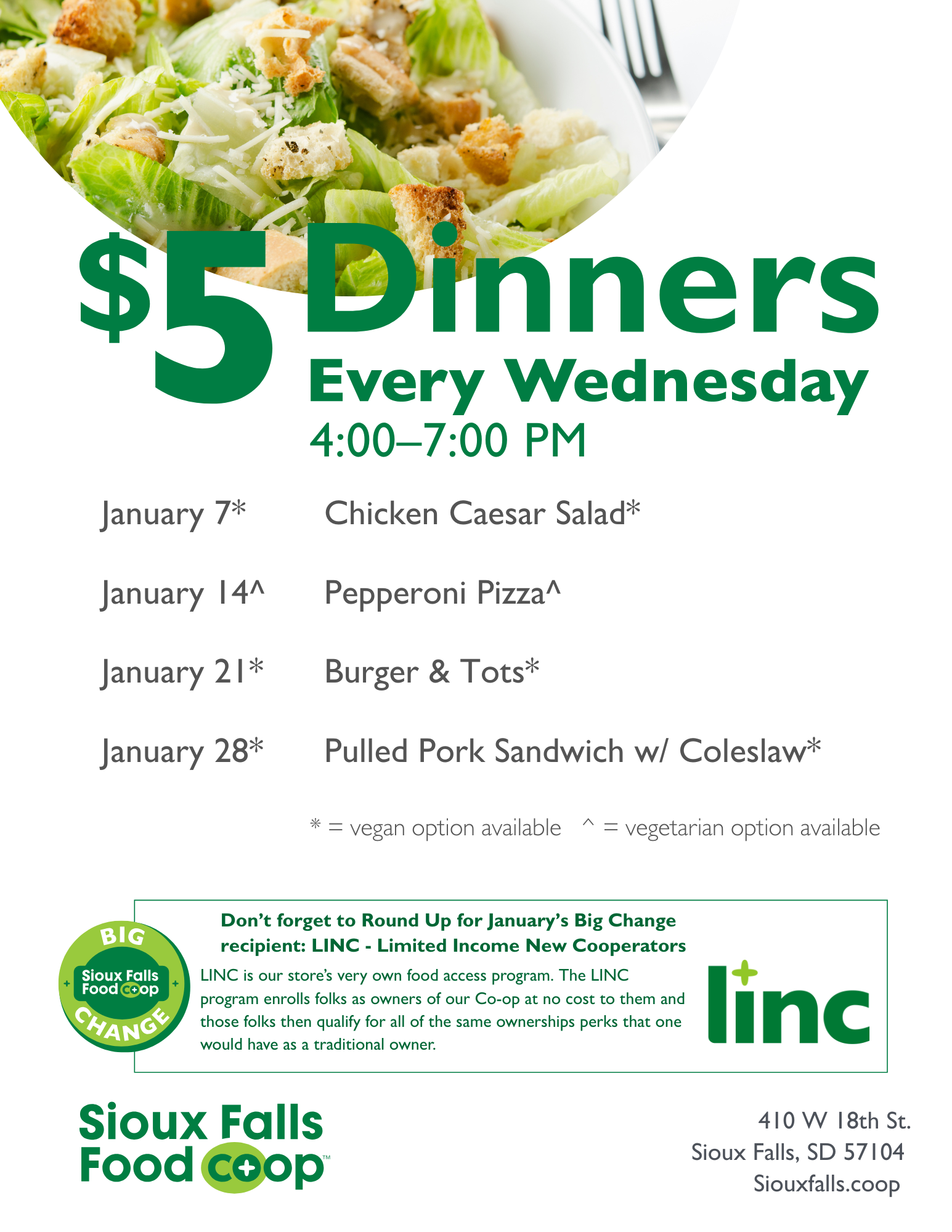 Every Wednesday, we serve a simple but delicious meal for just $5.00. Served 4pm-7pm or while supplies last. All are welcome all of the time – you do not have to be a member/owner to shop with us!